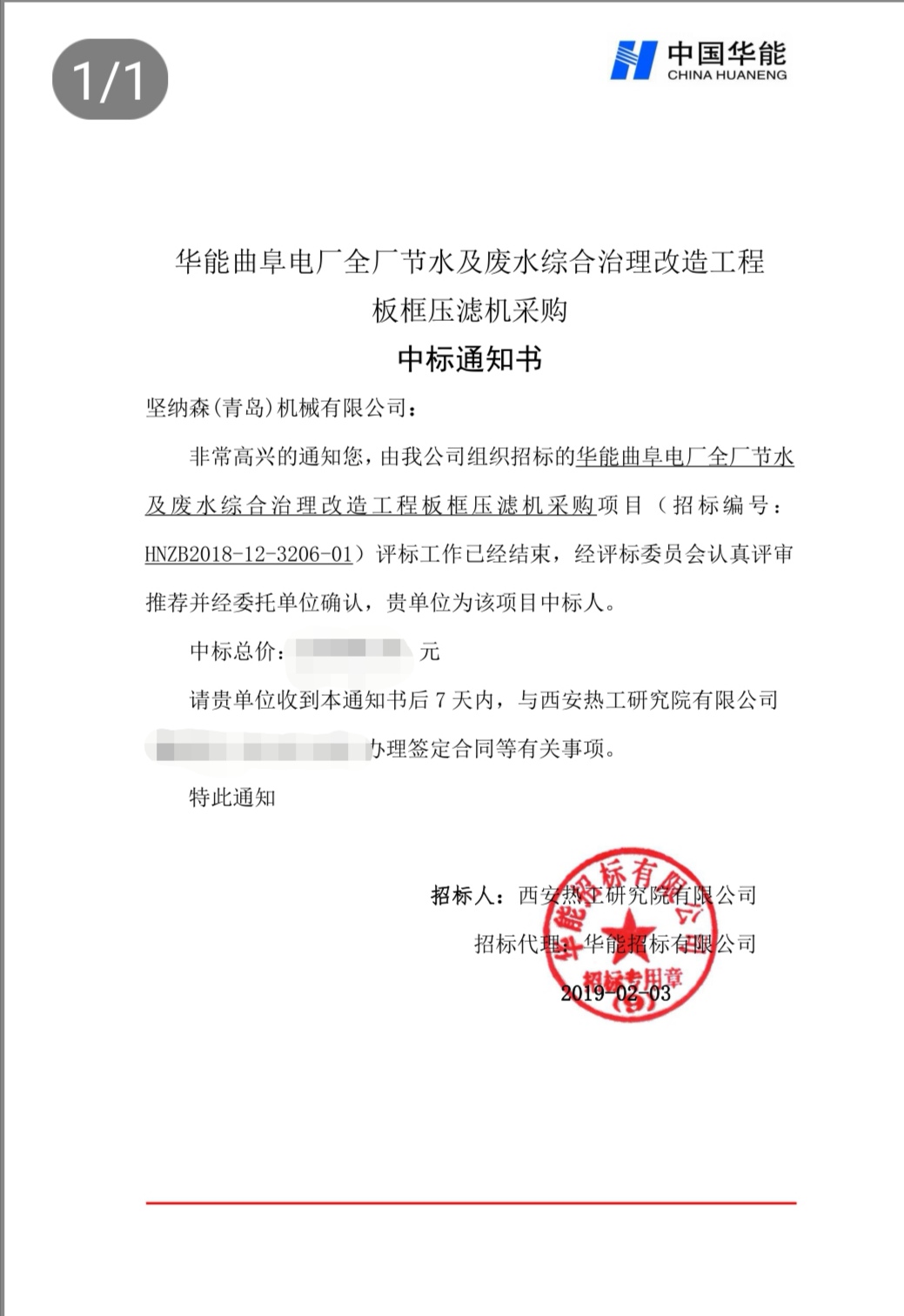 2019年2月3日(臘月二十九),春節(jié)前的最后一個工作日,堅納森(青島)機(jī)械有限公司,收到西安熱工研究院有限公司頒發(fā)的:《華能曲阜電廠全廠節(jié)水及廢水綜合治理改造工程板框壓濾機(jī)采購》中標(biāo)通知書。