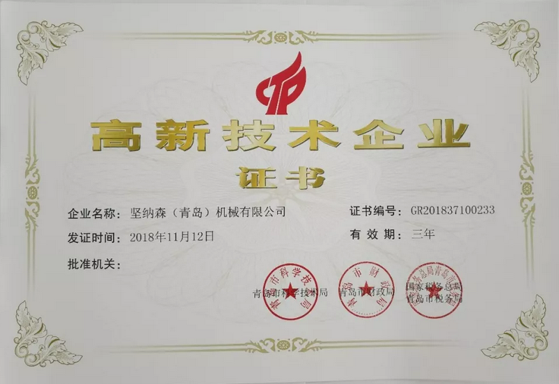 經(jīng)過(guò)幾年的努力,堅(jiān)納森(青島)機(jī)械有限公司于2018年通過(guò)了青島科技局、財(cái)政局、稅務(wù)局聯(lián)合組織的專(zhuān)家評(píng)審,以及國(guó)家科技部、財(cái)政部、稅務(wù)總局的復(fù)核,在2018年11月12日獲得由青島科技局、財(cái)政局、稅務(wù)局聯(lián)合頒發(fā)的《高新技術(shù)企業(yè)證書(shū)》。